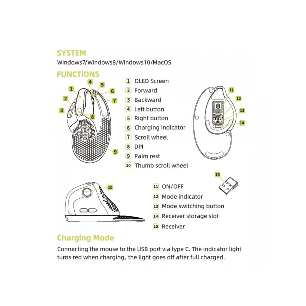 Specification Brand: DELUX Product Name: Ergo Vertical Mouse with OLED Screen Product Model: M618XSD SEEKER Connection: Wired (USB-C Soft Cable) + 2.4G Wireless (with USB Receiver) + BT 4.0 + BT 5.0 Screen: OLED Screen Keys: Left/Right Click, Scroll Wheel, Thumb Wheel, Forward/Backward and DPI Button DPI: 800/1200(default)/1600/2400/4000 (up to 7200 by software) Battery: Built-in Rechargeable 1000mAh Working Hours: About 30H (with light on, continuous use) Charging Hours: About 3H Compatible System: Windows 7/8/10, Mac OS (software only for Windows)