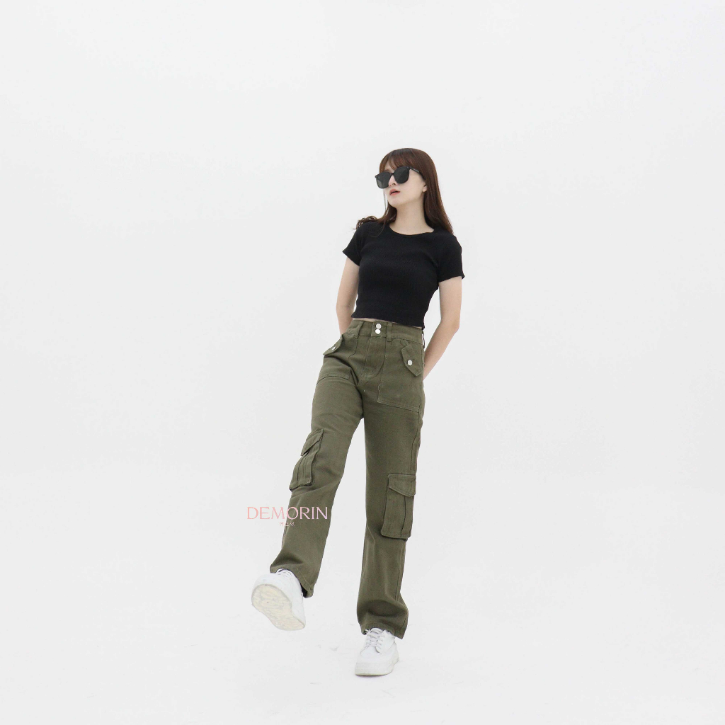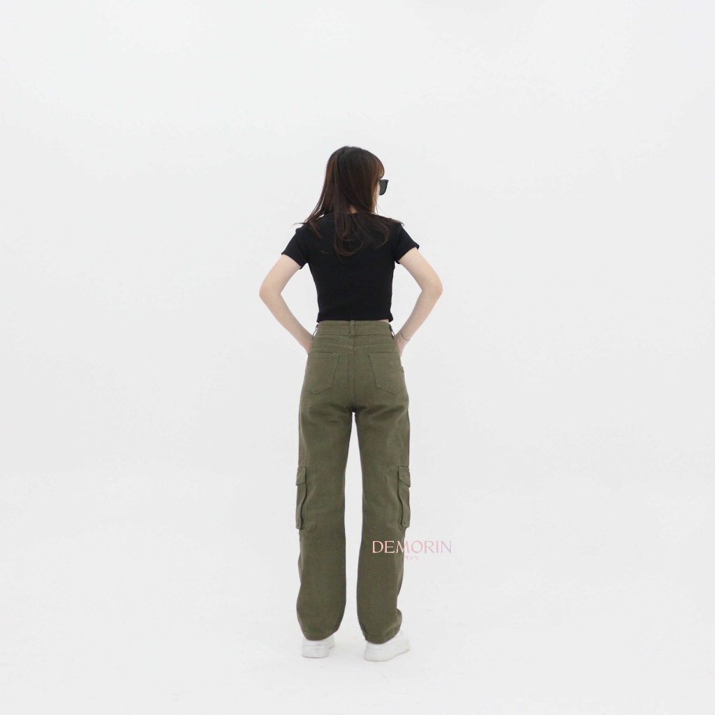 Detail DEMORIN - Celana Highwaist Cargo Jeans Straight Bawahan Wanita X56 Army