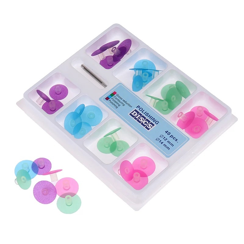 Diameter : 12mm+ 14mm Quantity : 40pcs / box Pink (Gross reduction) Green (Contouring) Blue (Finishing) Purple (Polishing) Finishing + polishing shinning for direct composite + 1 mandril