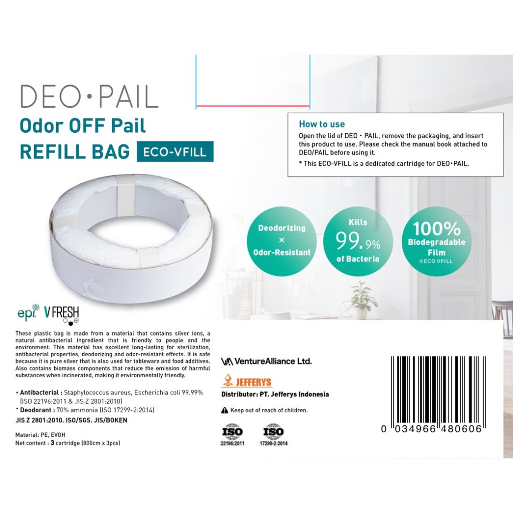 Deo Pail Basket sampah dg technology plastic utk : - penghilang bau tak sedap dari pampers (baby/org tua) - plastic bag yg bisa membunuh kuman (bakteri) s/d 99.9% - Menggunakan biodegradable Eco materials