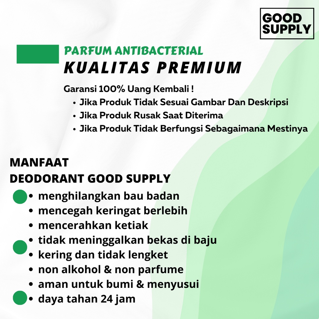Aroma Original, Untuk Aroma Lainnya Bisa Klik Ditoko Kami . Natural Deodorant By Good Supply Berbahan Alami Serta Wangi Nya Menggunakan Essential Oil, Tanpa Ada Kandungan Kimia Parfum Dan Alkohol. Deodorant Ini Juga Aman Bila Dipakai Ibu Hamil, Ibu Menyusui,Dan Anak Anak. . Deodorant Ini Mengandung Essential Oil, Aman Dan Banyak Manfaat Untuk Kulit Salah Satunya Melembutkan Ketiak,Menyembuhkan Luka Kecil/Ringan Dan Tidak Membuat Ketiak Iritasi. . Dan Deodorant Ini Mengandung Air Destilasi/ Air Suling Atau Aquadest, Agar Mudah Menyerap Di Kulit Ketiak Dan Tidak Membuat Kulit Luka Atau Iritasi. Potassium Alum Atau Biasa Disebut Tawas Yang Baik Untuk Kesehatan Ketiak, Mencegah/Mengontrol Minyak Berlebih, Dan Dalam Kehidupan Bahan Ini Tidak Mencemari Lingkungan. . Manfaat Natural Deo : - Menghilangkan Bau Badan - Mencegah Keringat Berlebih - Mencerahkan Ketiak - Tidak Meninggalkan Bekas Di Baju - Kering Dan Tidak Lengket - Non Alkohol & Non Parfume - Aman Untuk Bumil & Busui - Daya Tahan 24 Jam . Cara Pakai : - Kocok Terlebih Dahulu Sebelum Pemakaian - Aplikasikan Pada Ketiak Setelah Mandi Dan Semprot 2-3 Kali - Selamat Beraktifitas Tanpa Takut Bau Keti Mengganggu . Garansi 100% Uang Kembali ! Jika Produk Tidak Sesuai Gambar Dan Deskripsi Jika Produk Rusak Saat Diterima Jika Produk Tidak Berfungsi Sebagaimana Mestinya Mohon Chat Admin Sebelum Penilaian, Terimakasih