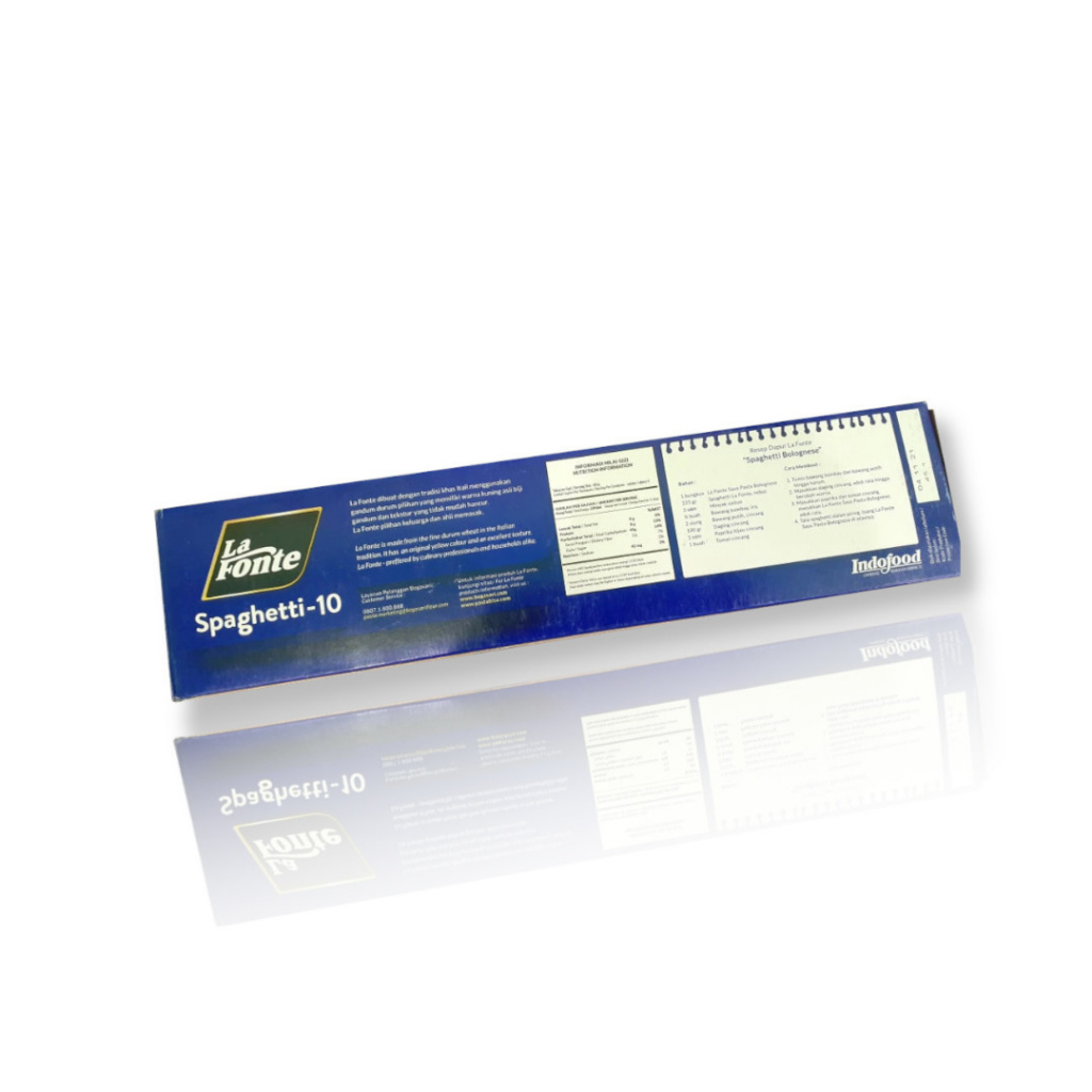 La Fonte Spaghetti adalah pasta berbentuk panjang (long pasta) yang paling sering digunakan untuk memasak pasta. Terbuat dari Semolina gandum durum pilihan. Pasta ini bisa disajikan dengan hampir semua jenis saus. Contohnya saus tomat, krim susu, tumisan, dengan daging, sayuran dan ikan. La Fonte Spaghetti kemasan 225gr berdi
