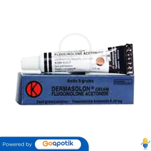 Deskripsi : PENGGUNAAN OBAT INI HARUS SESUAI PETUNJUK DOKTER. Terapi topikal untuk dermatosis | Komposisi : Tiap gram krim mengandung Fluocinolone acetonide 0,25 mg | Dosis : ATURAN PAKAI HARUS SESUAI DENGAN PETUNJUK DOKTER. Gunakan 2-3 kali sehari | Indikasi : Terapi topikal untuk dermatosis | Perhatian Khusus : Pemakaian jangka panjang & berlebihan pada kehamilan. Penggunaan pada wajah. | Kemasan : Tube 5 gram krim | NIE : DKL8909304429A1
