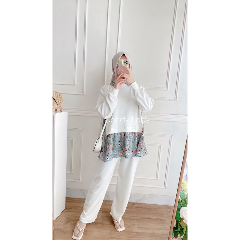 Bahan Knit premium mix Cotton Crinkle. Bahannya knitnya tebal, jatuh dipakai, menyerap keringat dan pastinya comfy to wear. Celana full karet. Non Busui