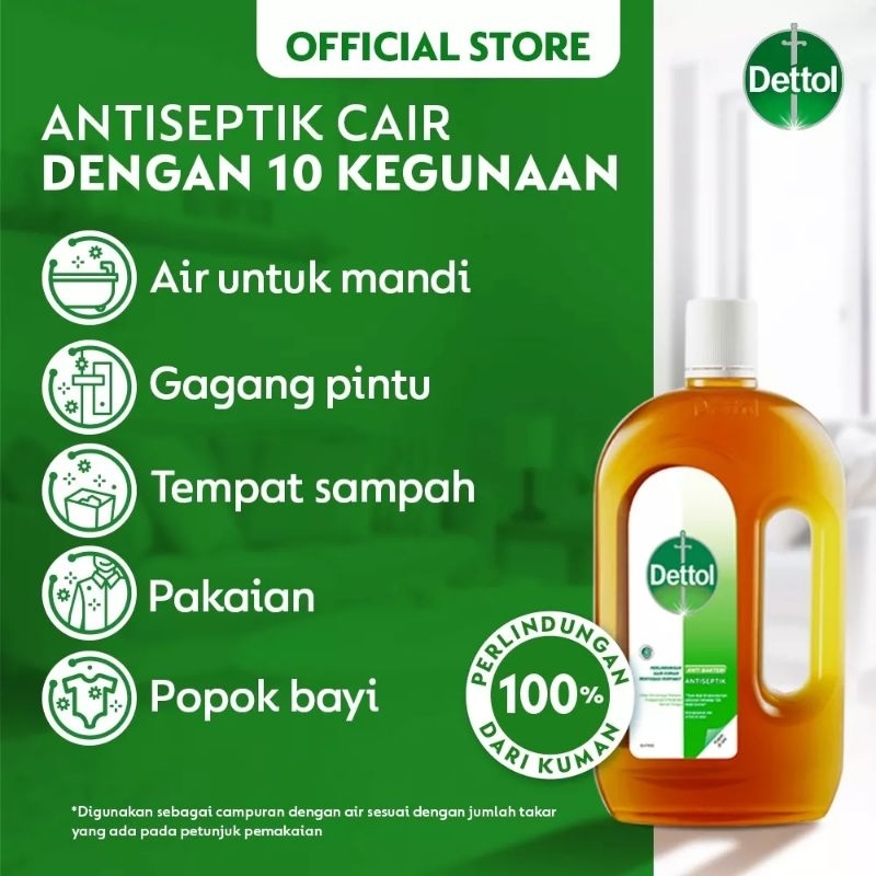 Dettol Antiseptic Liquid merupakan antiseptik cair serbaguna yang berfungsi untuk melindungi keluarga dari kuman penyakit. Dan juga dapat membantu melindungi tubuh dari infeksi. Serta dapat membunuh 100 kuman penyebab penyakit (di air, perabot dapur dan cucian).