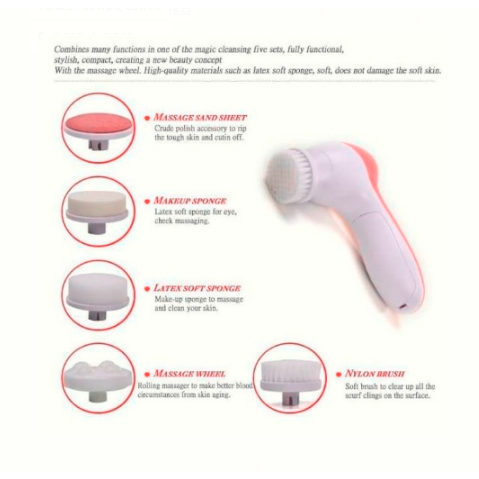 Alat kecantikan beauty care Massager 5 in 1 ini terdiri dari 5 alat 5 fungsi yang berbeda, yang terdiri dari : 1. Batu penggosok ( berfungsi untuk menggangkat kulit* mati & menghaluskan bagian kulit* yg keras) 2. Sikat ( berfungsi membersihkan kulit* mati setelah digosok dengan batu penggosok) 3. Spons kasar ( dapat berfungsi membersihkan kulit* ) 4. Spons halus ( berfungsi membersihkan sisa make up) 5. Bola pijit ( bisa berputar, berfungsi untuk memijat* sebagai relaksasi agar terlihat lebih fresh)