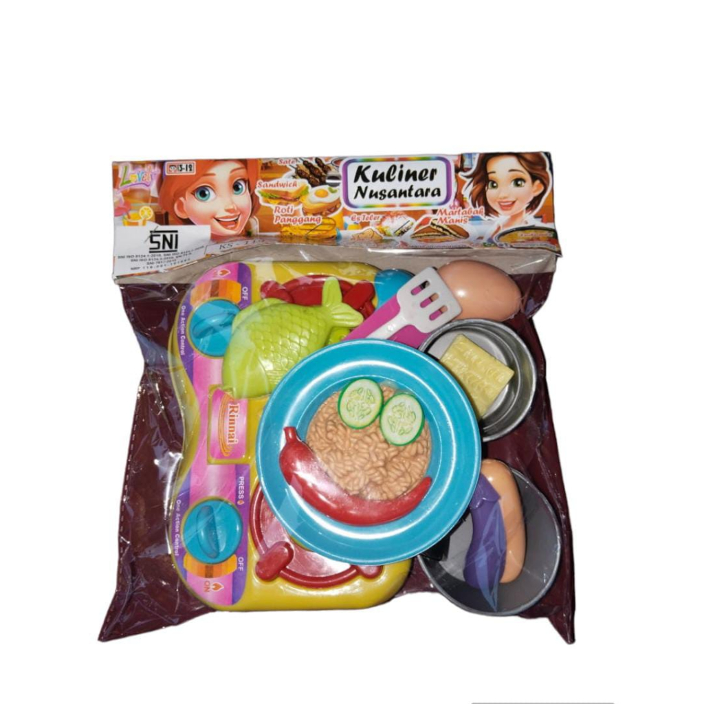 mainan masakan ini cocok untuk menemani anak saat bermain bisa menjadi juru masak yang handal atau sering di sebut koki. mainan ini di lengkapi dengan: -kompor -teflon -panci -piring -telur/SOSIS -spatula -terong -pisau -nasi goreng -mie -contong -ikan -cabai -pisau besar ukuran: P=24cm L=19cm T=6cm