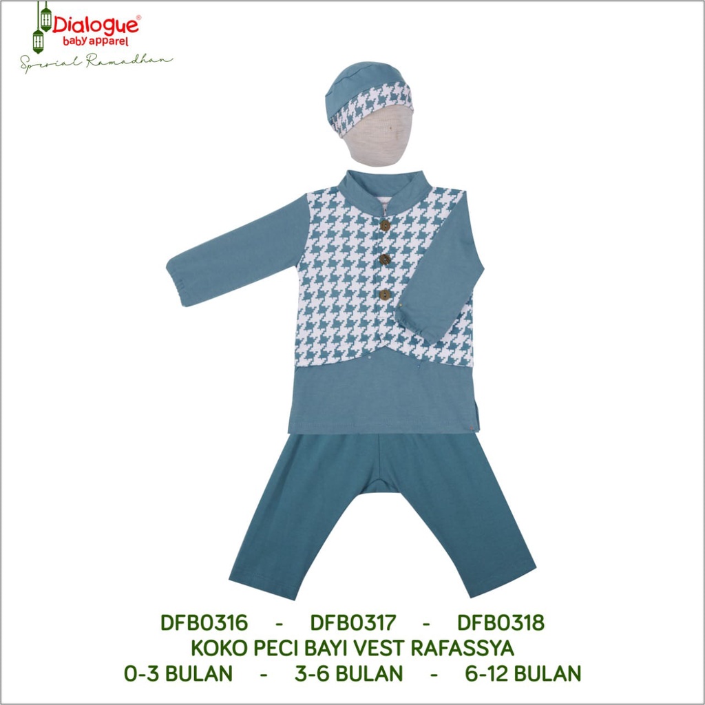 Dialogue Baby Koko Peci Bayi Vest Set Raffasya - DFB0316 DFB0317 DFB0318 Warna : Pale, Blue, Granite Green, Muted Clay. Bahan : Cotton Rich Ukuran : DFB0316 (0-3 bulan) : Baju P 35cm, L 24cm, PL 20cm. Celana P 37cm, L 17cm. DFB0317 (3-6 bulan) : Baju P 37cm, L 26cm, PL 22cm. Celana P 39.5cm, L 17.5cm. DFB0318 (6-12 bulan) : Baju P 39cm, L 28cm, PL 24cm. Celana P 42cm, L 18cm. Keunggulan : - Menggunakan bahan High Quality Cotton Rich yang telah lulus standard SNI sehingga moms merasa aman saat buah hati menggunakan produk ini. - Bahan ini juga memiliki sirkulasi udara yang baik, lembut dan tidak panas ketika dikenakan si buah hati. - Desain pakaian lebaran dengan paduan kain houndstooth dan polos menciptakan kesan modern dan elegan.