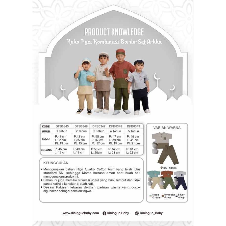 Dialogue Baby Koko Peci Set Arkha - DFB0345 DFB0346 DFB0347 DFB0348 DFB0349Warna : Teracotta, Grey, Blue, dan Khaki Bahan : Cotton Twill Ukuran : 1 tahun : Baju P 44cm, L 32cm, PL 13cm. Celana P 47cm, L 18cm 2 tahun : Baju P 46cm, L 35cm, PL 14cm. Celana P 51cm, L 19cm 3 tahun : Baju P 48cm, L 37cm, PL 15cm. Celana P 55cm, L 20cm 4 tahun : Baju P 50cm, L 39cm, PL 16cm. Celana P 59cm, L 21cm 5 tahun : Baju P 52cm, L 41cm, PL 17cm. Celana P 63cm, L 22cm Keunggulan : - Menggunakan bahan high quality cotton twill yang telah lulus standard SNI sehingga moms merasa aman saat buah hati manggunakan produk ini. - Bahan ini juga memiliki sirkulasi udara yang baik, lembut dan tidak panas ketika dikenakan si buah hati. - Desain pakaian lebaran dengan paduan kain bermotid dan polos menciptakan kesan modern dan elegan.