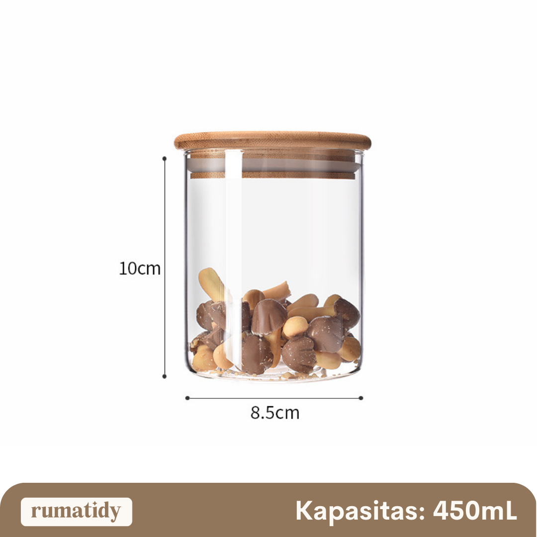 Perlengkapan Rumah > Peralatan Dapur > Tempat Penyimpanan Makanan > [DIAMETER 8.5cm] FULLSET Toples Snack Kaca Bulat Tutup Kayu Borosilicate Diameter 8.5cm Kedap Udara Makanan Tempat Penyimpanan Cereal Toples Kotak Bening Kontainer Makanan