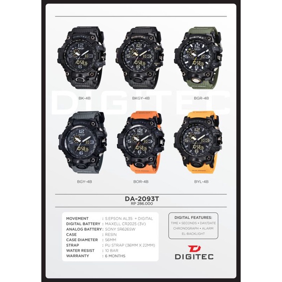 MOVEMENT : S.EPSON AL35 + DIGITAL DIGITAL BATTERY : MAXELL CR2025 (3V) ANALOG BATTERY : SONY SR626SW CASE : RESIN CASE DIAMETER : 56MM STRAP : PU STRAP (36MM X 22MM) WATER RESIST : 10 BAR