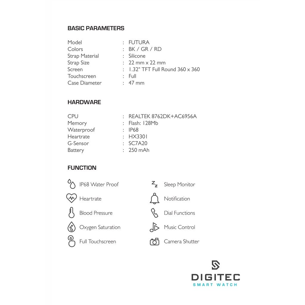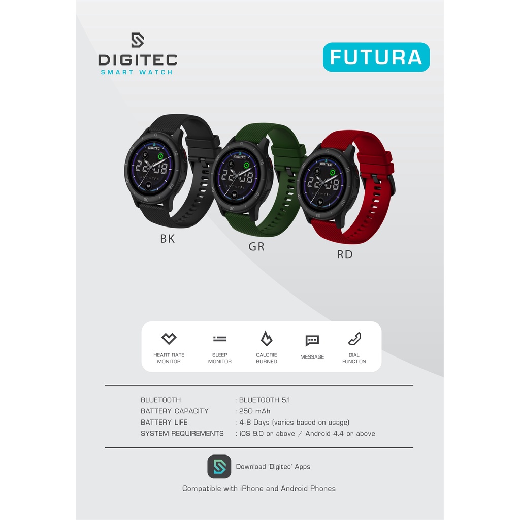 Model = FUTURA Warna = BLACK/GREEN/RED Strap = Silikon Layar = 1.32" TFT Full Round 360 x 360 Layar Sentuh = Full Case Diameter : 4,7cm