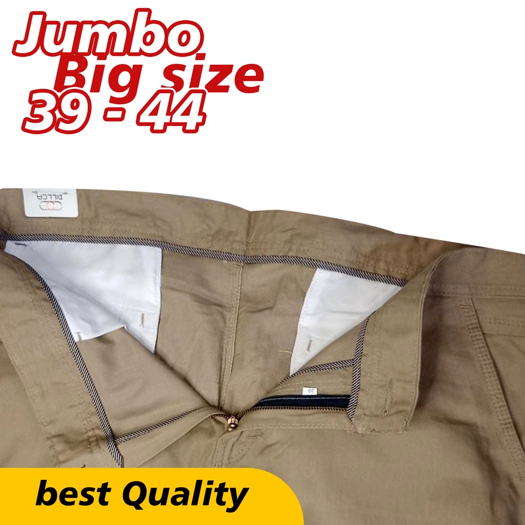 BRAND DILLCA ORIGINAL TERBARU SIZE JUMBO Celana chinos streach melar berbahan diamont grade a import dengan full peping jahitan size 39 sampai 44 untuk detail size sebagai berikut : SIZE 39 : 40,5 INCHI 103CM