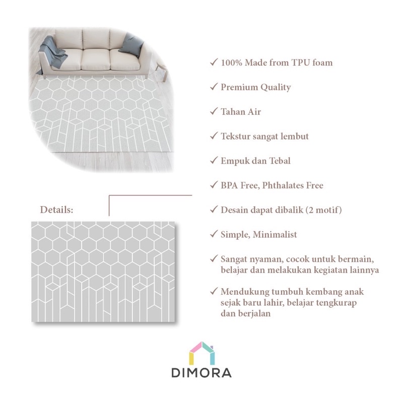 Dimora TPU Play Mat bisa menjadi salah satu cara untuk meningkatkan perkembangan si kecil. Melalui alas yang lembut dan nyaman, si kecil akan memiliki ruang untuk bermain dengan aktif dan menyenangkan, belajar, tidur dan beraktifitas lainnya yang akan menstimulasi perkembangannya. Fitur dan Keunggulan Dimora Premium Baby TPU Play Mat: 100% Made from TPU foam Premium Quality Lapisan Mudah Dibersihkan, Tahan Air Tekstur lembut Empuk dan Support yang Baik BPA Free, Phthalates Free Desain dapat depan dan belakang (2 motif) Desain Simple, Modern dan Menarik untuk Setiap Ruangan Sangat nyaman, cocok untuk bermain, belajar dan melakukan kegiatan lainnya Mendukung tumbuh kembang anak sejak baru lahir, belajar tengkurap dan berjalan Kualitas Tinggi dan Memiliki Sertifikat Keamanan: European Standard EN71, CE America ASTM F963-17