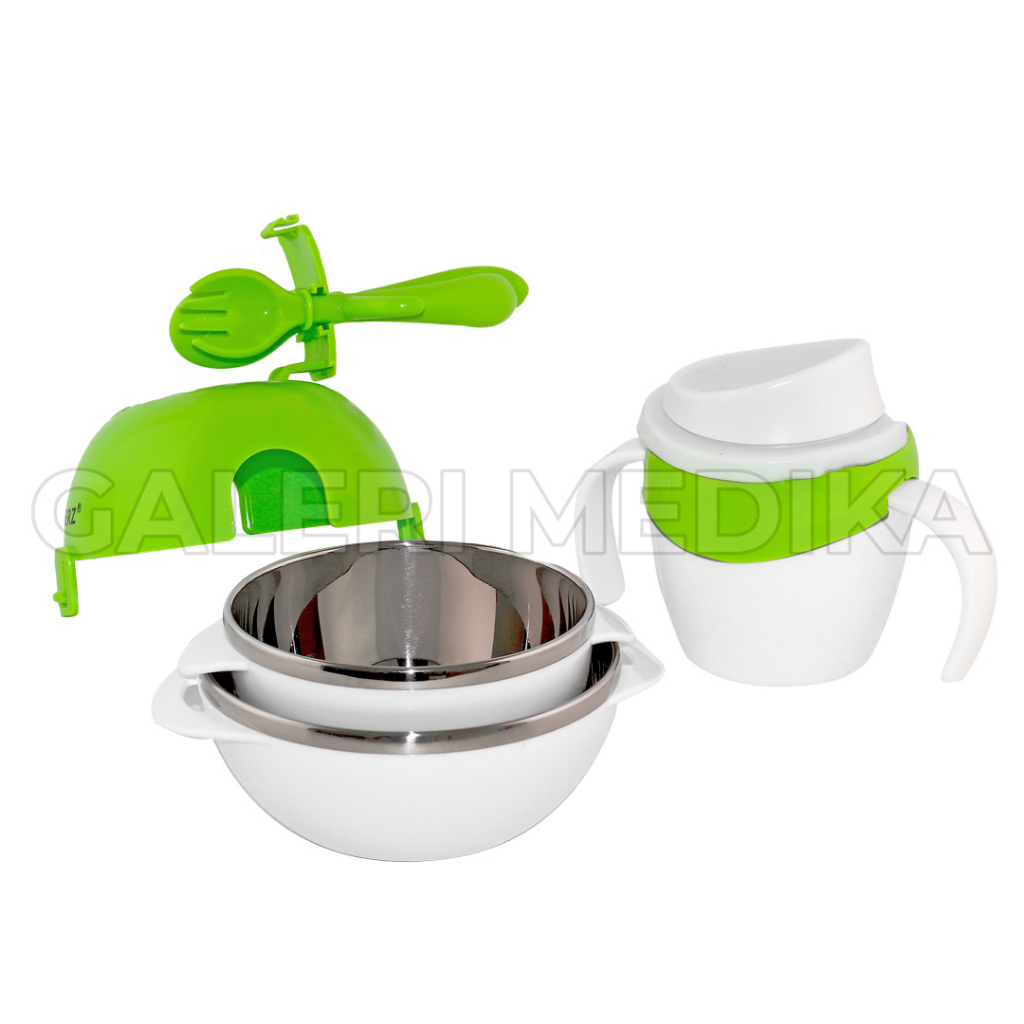 Dinnerware Set Bayi Berz BZ8603 merupakan set perlengkapan tempat makan bayi dan anak dengan bahan stainless steel yang aman untuk digunakan, higenis dan mudah dibersihkan. Dengan desain multifungsi 5in1 memungkinkan bagi para ibu untuk menyiapkan makan kapan saja dan di mana saja. 2 set ukuran mangkuk yang berbeda (ukuran besan 300 ml/vol dan ukuran kecil 280 ml/vol). Dengan bahan stainless steel cocok untuk pengawetan panas lebih lama, namun aman bagi anak-anak karena dilapisi PP shell untuk melindungi tangan tanpa melepuh.