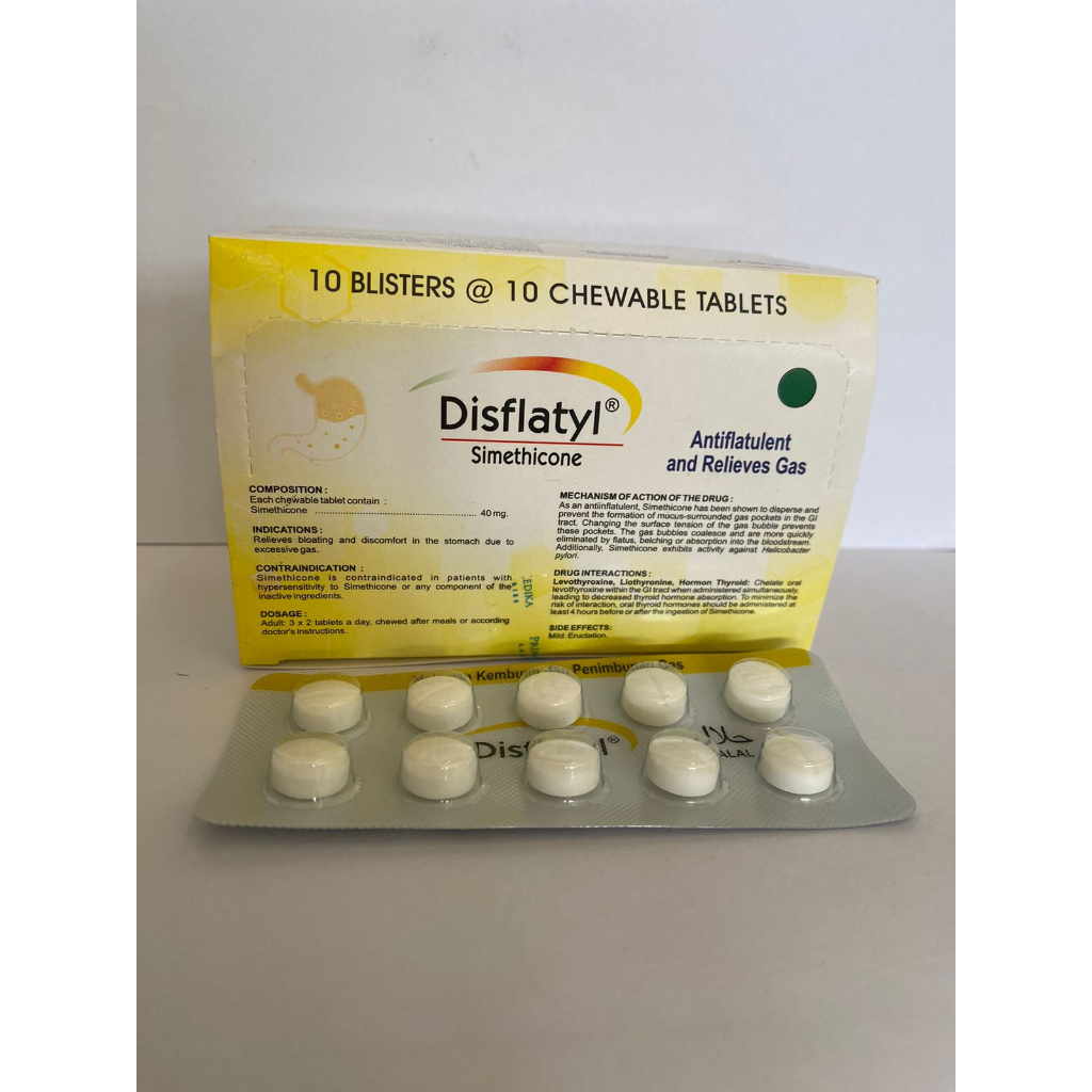 Disflatyl merupakan tablet kunyah yang mengandung simethicone yang berfungsi untuk membantu meringankan gangguan pencernaan seperti kembung dan penimbunan gas.