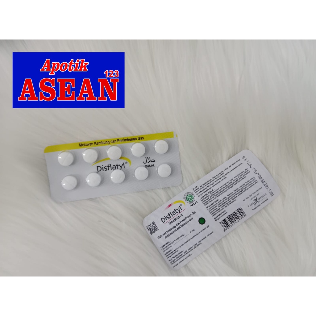 Mengurangi penimbunan gas dalam saluran cerna, perasaan penuh pada epigastrium, meteorismus sementara dan pasca operasi, sindrom gastrokardiak, persiapan pemeriksaan dengan sinar X dan sebelum gastroskopi. Komposisi Simethicone 40 mg Dosis Dewasa : 1-2 tablet dikunyah sesudah makandan sebelum tidur. Persiapan untuk pemeriksaan sinar X, 1-2 tablet 2-3 hari sebelum pemeriksaan. Aturan Pakai Diberikan sesudah makan. Dikunyah sampai halus. Perhatian Konsultasikan dengan dokter sebelum menggunakan Disflatyl tablet untuk ibu hamil atau menyusui Kontra Indikasi Aritmia, Hipokalsemia, Hipomagnesia, CHF, Jantung Iskemik Efek Samping Faringitis, Ruam kulit, Angiodema Golongan Produk Obat Bebas (Hijau) Kemasan Dus, 10 Strip @ 10 Tablet Kunyah Manufaktur Pharos No. Registrasi BPOM: DBL1940404763A1