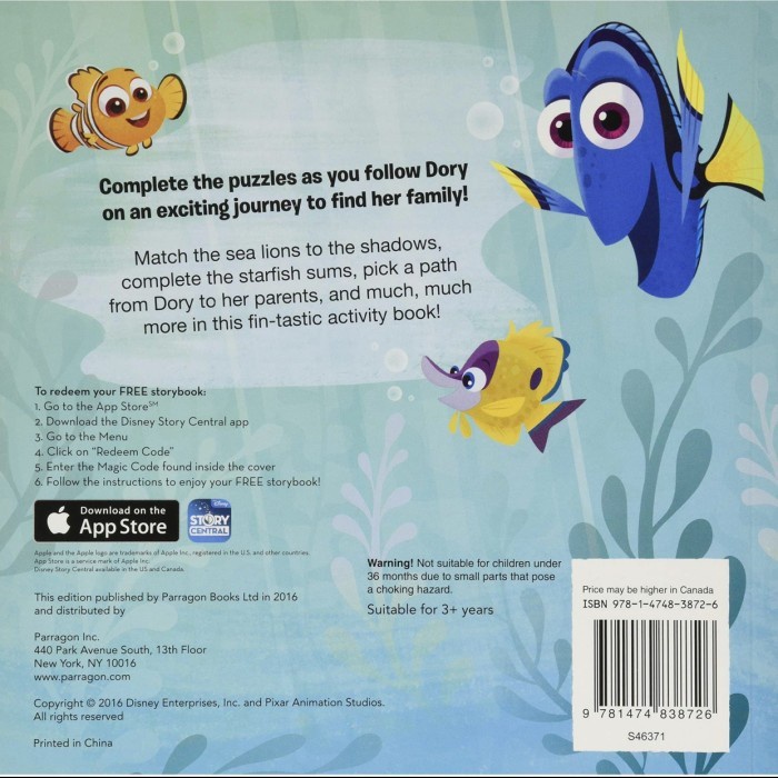 Complete the puzzles as you follow Dory on an exciting journey to find her family! Match the sea lions to the shadows, complete the starfish sums, pick a path from Dory to her parents, and much, much more in this fin-tastic activity book!