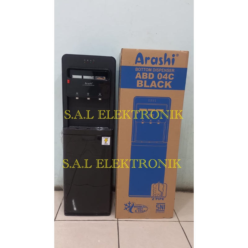 Arashi Water Dispenser ABD04C: -Panas,Normal,Dingin -Galon bawah -Daya:5W-600W -Plastik PP dan ABS -Lampu indikator -Panjang kbel 1.5M