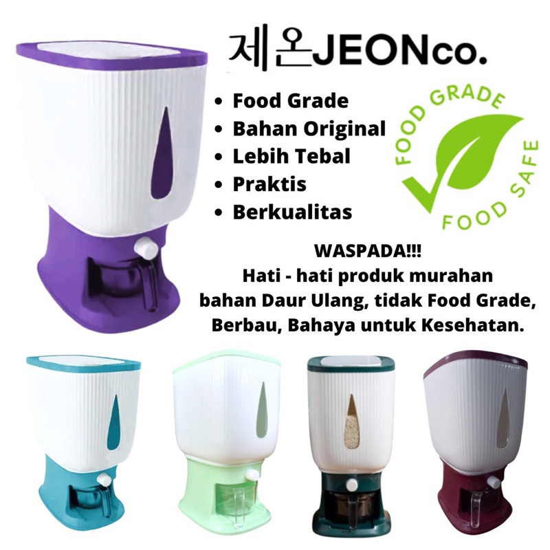 Benefits dan kegunaan: - Dispenser untuk penyimpanan bahan kering seperti beras, biji-bijian, ataupun makanan hewan. Tertutup rapat agar terhindar dari kontaminasi kutu, serangga, debu. - Cara pakai simpel, tinggal tuang beras ke dalam, kalau mau pakai, tinggal sedia wadah + tekan tombol aja, langsung keluar deh berasnya. Ga perlu cedok2 lagi - Key selling point: bahan food grade dan tahan lama, model paling baru super estetik, ringan dan simpel