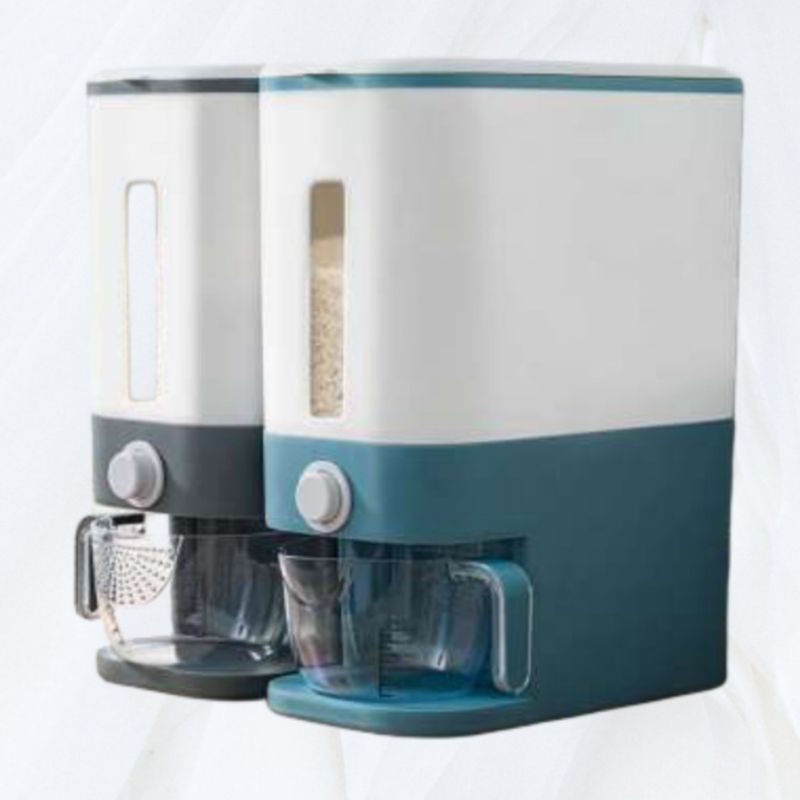 Dispenser beras otomatis anti hama dan lembab dilengkapi cangkir untuk mengukur dengan saringan. Tempat beras dengan menggunakan material yang aman untuk beras sehingga beras yang disimpan awet dan tidak berkutu, tidak merusak kualitas beras yang disimpan. Dengan bukaan lebar diatasnya sehingga memudahkan saat memasukan beras plus pencuci beras yang praktis.