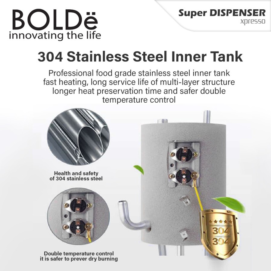 Spesifikasi: - Merek: Bolde - Tipe: Super Smart Fountain Xpresso - Warna: hitam / coklat / merah muda (wajib dicantumkan di catatan jika request warna tertentu) - Large Screen Display - Fast cooling compressor technology - Double Outlet - Kontrol Touch Panel pintar - Double Layer Scalding Kettle - Heat Preservation - Remote Control - Voltage : 220V - Power : 85 Watt (cool); 1355 Watt (hot) - Capacity : 8L/H - Heat Temperature : 500C-1000C - Cool Temperature : 5-100C - Colour : Black* - Dimension: 375 x 370 x 795mm - Garansi Bolde 1 tahun