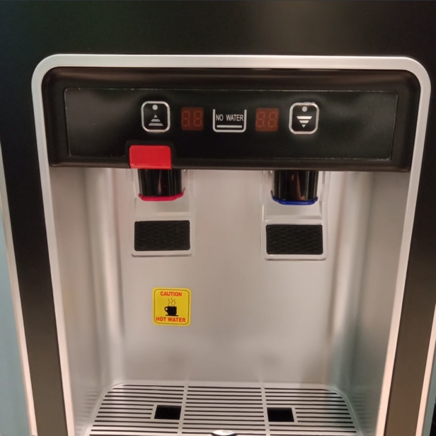 Model Minimalis Terbaru Tampilan lampu dengan tombol Lampu Indikator Penanda Status dan Sisa Air Sinyal Peringatan Bila Galon Hampir Habis Lampu Malam LED System Keamanan Ganda untuk mencegah panas berlebih Kunci Pengaman Air Panas untuk Anak-anak Pipa dalam terbuat dari Stainless Steel Hitam dengan kombinasi silver