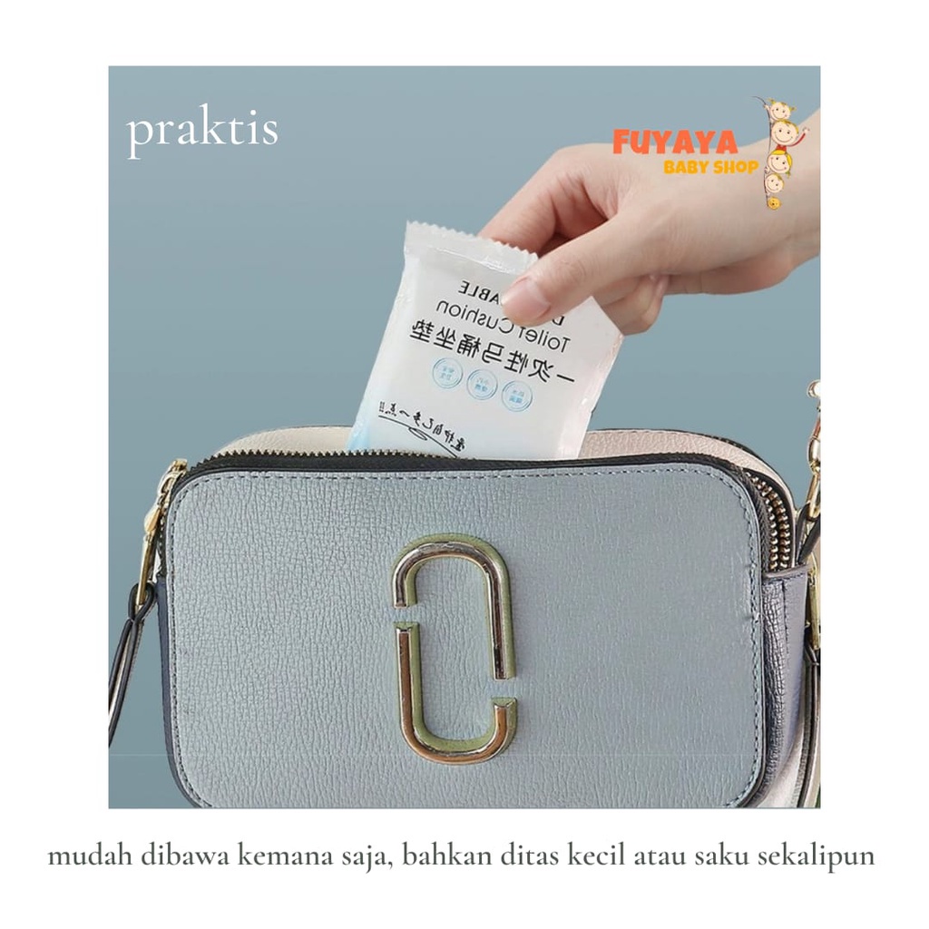 Disposable Toilet Cushion Produk ini cocok untuk dibawa berpergian (traveling) saat menggunakan toilet umum agar lebih higienis guna menghindari penyebaran bakteri akibat penggunaaan toilet bersama secara bergantian.