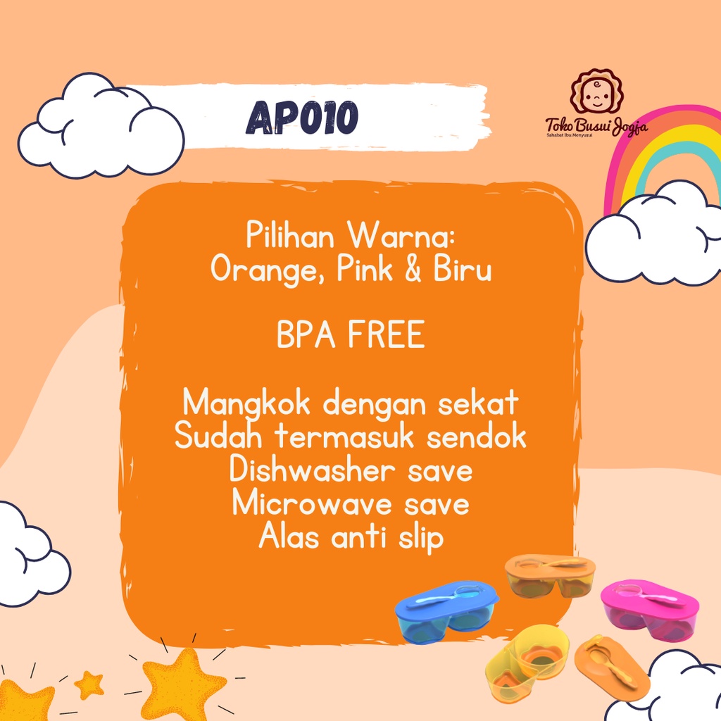 Detail Divided Bowl With Spoon Baby Safe / Mangkok dan Sendok Makan Bayi AP010 FB001 Sendok Sensor Makan Mpasi Bayi Twin Taste Bowl Set