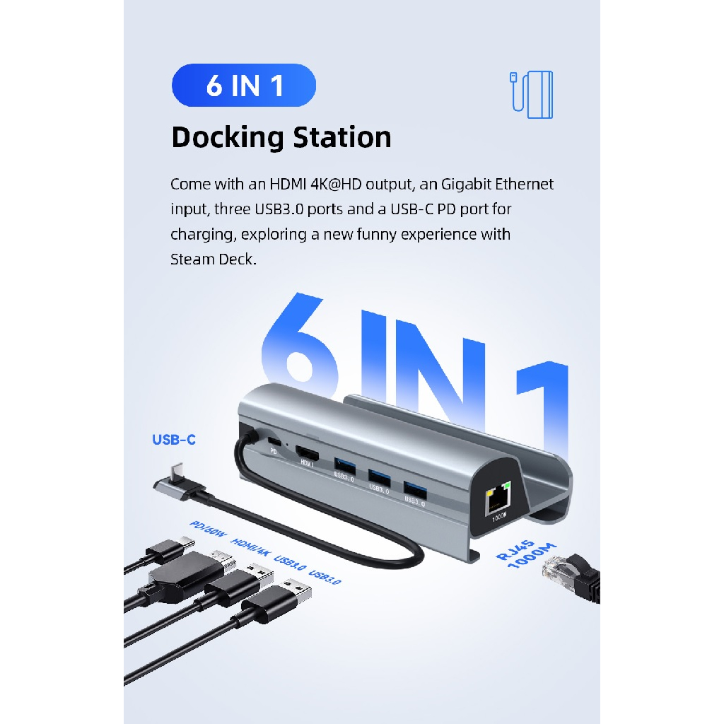 Specification Product Name: 6-in-1 Docking Station Product Model: HC-86 Compatible with: Steam Deck Material: Aluminum Alloy + ABS Interfaces: 3x USB 3.0 ports, 1x HDMI 2.0 port, 1x RJ45 Ethernet LAN port, 1x USB-C PD Input port