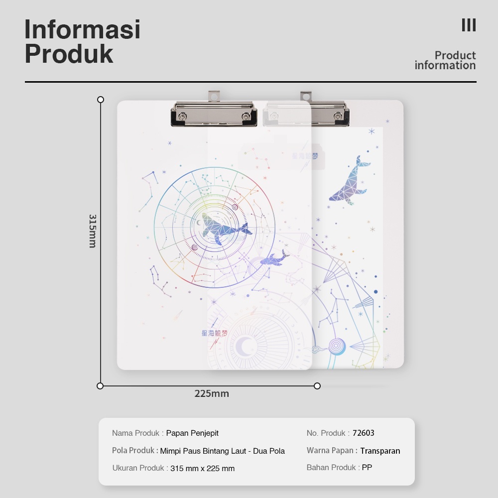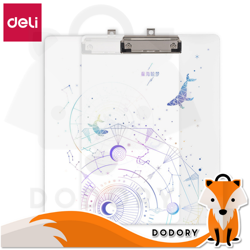 Deskripsi : Merk: Deli Ukuran papan: 31.5 x 22.5 cm Untuk kertas A4 Bahan plastik PP, kuat dan lentur Klip Logam anti korosi Motif tema gambar laut dan paus yang dibuat dengan teknologi laser Cocok untuk keperluan sekolah atau kantor