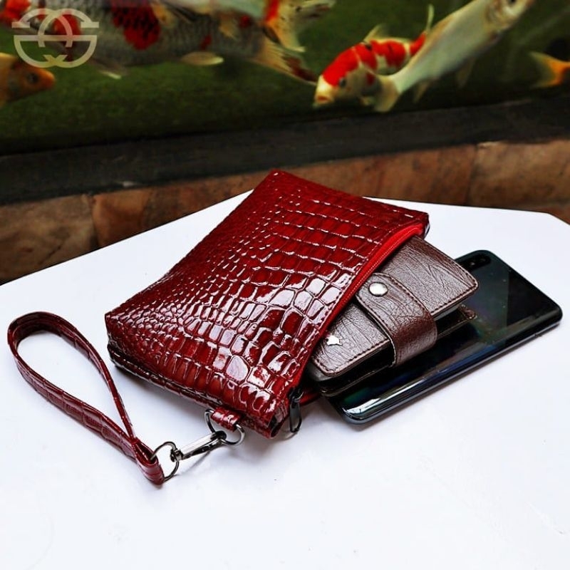 bahan : kulit croco (dalaman pakai lapisan) ukuran : 21x12 spesipikasi : terdiri 1 ruang 1 resleting dompet multifungsi hp muat max 7in, uang kertas koin dll, dapat tali
