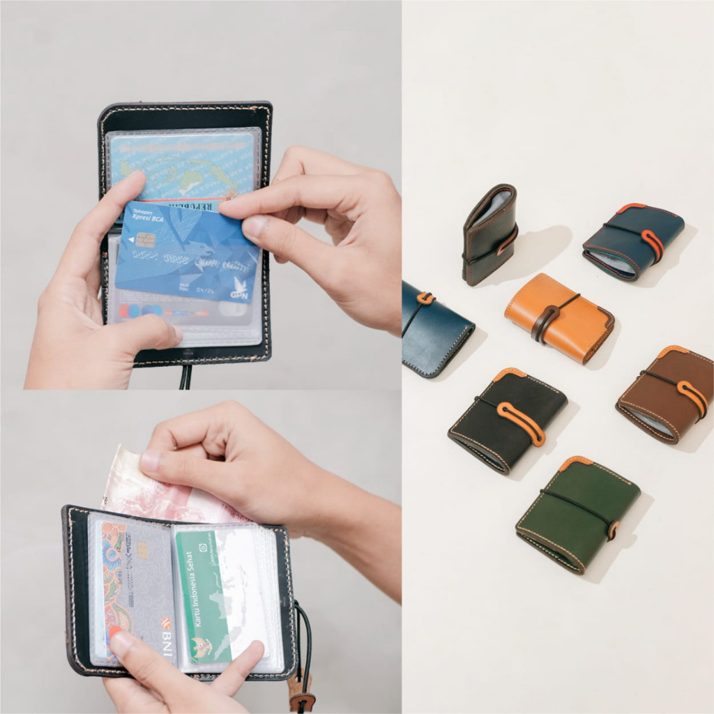 Dompet kartu mika dengan material kulit asli yang dapat menampung banyak kartu dan juga dilengkapi dengan slot untuk menyimpan uang kertas