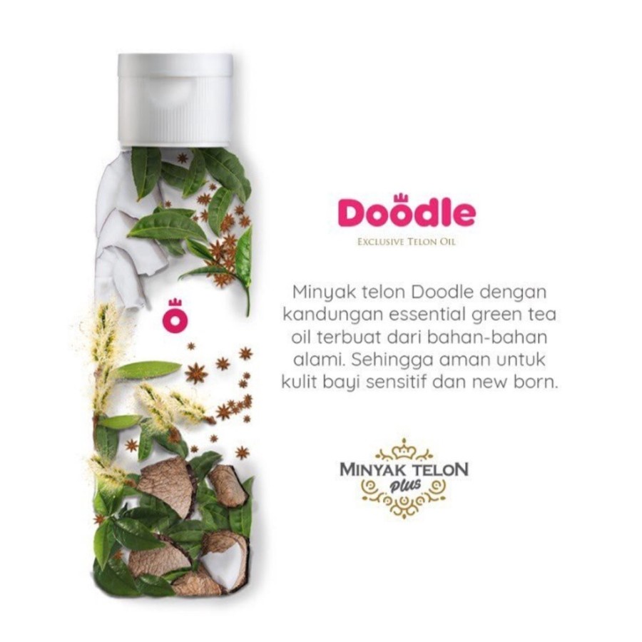 Doodle Exclusive adalah minyak telon plus yang memiliki formulasi terbaru dan berbeda dari minyak telon lainnya. Terdiri dari bahan-bahan 100% alami: - Oleum Cocos - Oleum Cajuputi - Oleum Anisi - Oleum Sweet Green tea.