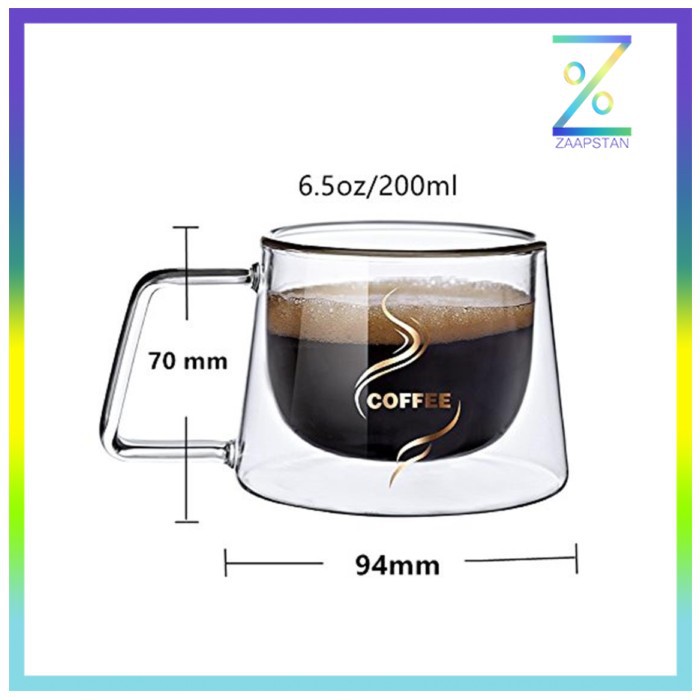 Double Glass Design Gelas cangkir ini memiliki 2 lapisan kaca dimana kaca bagian dalam untuk menyeduh minuman panas seperti kopi dan teh, dan kaca bagian luar untuk menggenggam gelas.