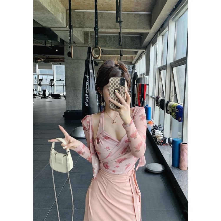 Detail Dopamin Setelan Kardigan Tersembunyi Wanita, Set Dua Potong Kardigan Motif Bunga Kamisol Pinggang Ti
