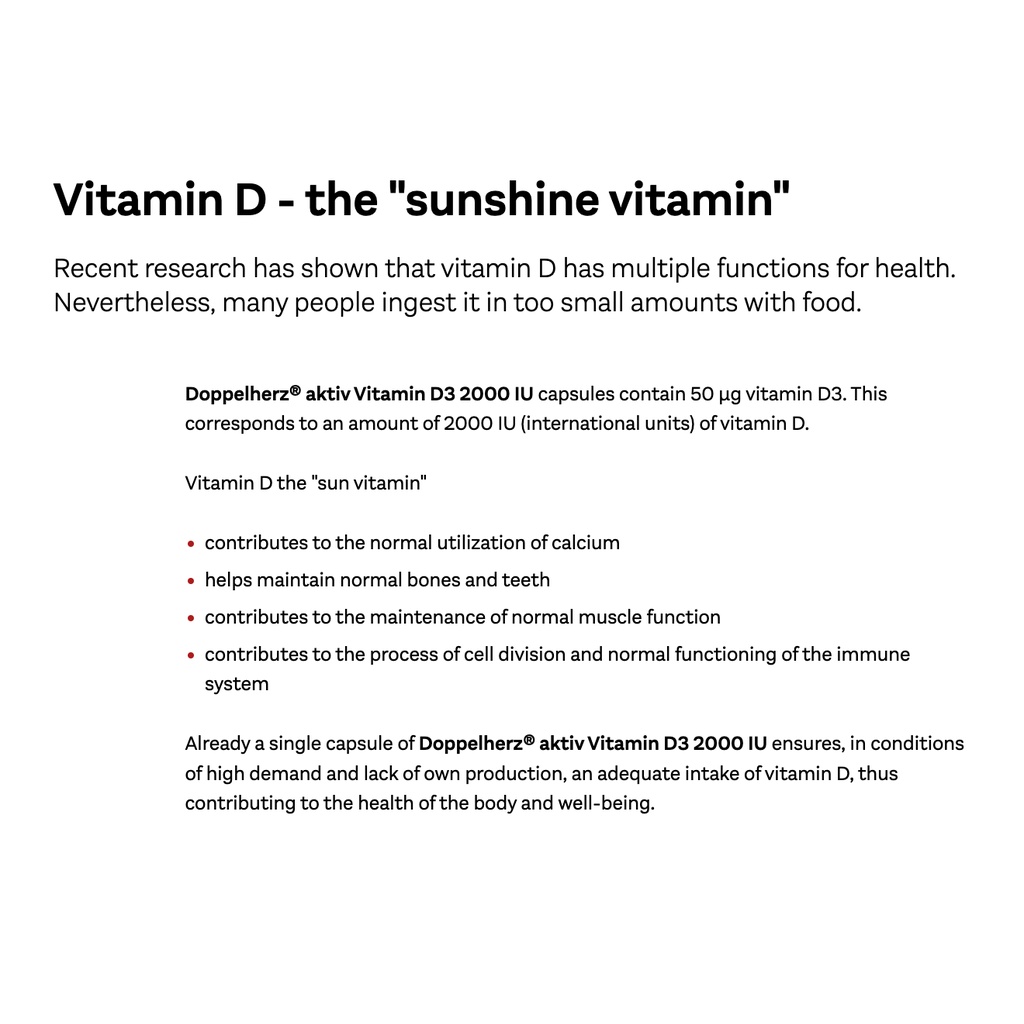 Karena tingginya konsumsi dan kurangnya produksi dari dalam tubuh, satu kapsul Doppelherz® aktiv Vitamin D3 2000 IU akn mencukupi asupan vitamin D3 dalam darah. Asupan vitamin D yang cukup, akan berkontribusi pada kesehatan dan kesejahteraan, tubuh tulang dan jantung.