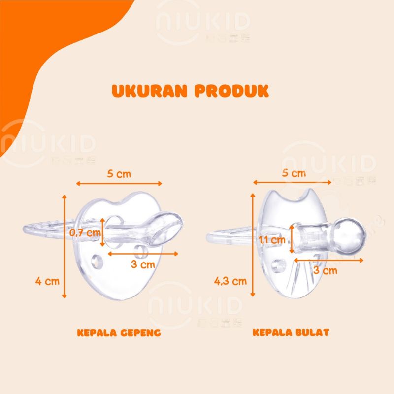 Empeng full silikon bening, dot gepeng. TANPA KEMASAN. Jangan direbus/ dimasak. Hanya bilas dengan air hangat!