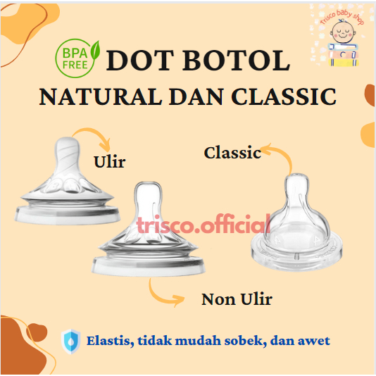 Deskripsi Produk : *(Dot Import OEM didesain menyerupai produk nipple botol natural dan Cassic yang kualitasnya terjamin dan BPA Free)* 1. Tipe Natural ulir = niplpe yang ada motif garis melingkar ( model baru bawaan botol ) 2. Tipe Natural non ulir = nipple polos tanpa garis melingkar ( model lama ) 3. Tipe Classic 3. Barang imprt OEM, bahan silikon berkualitas sangat fleksible, elastis, dan tidak mudah sobek 4. Tidak cocok untuk nipple botol susu merk lain 5. Kemasan tanpa box, dijual satuan 6.BPA Free sehingga aman untuk si buah hati 7. Katup dot didesain untuk menghindari bayi bingung puting 8. Katup dot akan mengalirkan cairan mengikuti ritme menyusui bayi 9. Katup dot bersifat anti-kolik. 10. Prosesnya katup dot akan mengarahkan udara untuk masuk ke dalam botol dan bukan ke arah bayi. 11. Bayi pun terhindar dari kemungkinan udara yang menumpuk di dalam perut. 12. Dot terbuat dari bahan silikon yang lembut dan fleksibel dan tahan lama 13. Terdapat berbagai macam size menyesuaikan usia dan kebutuhan si kecil