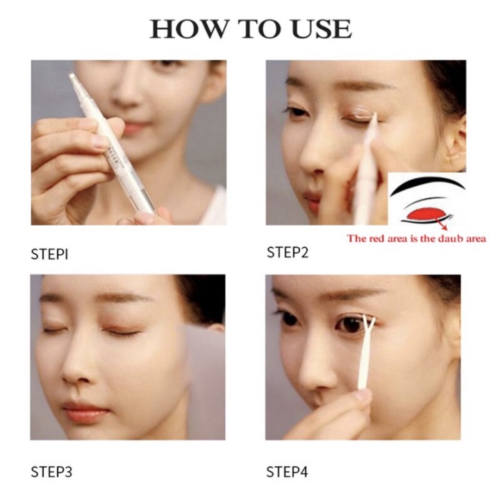 CARA PEMAKAIAN : 1. Aplikasikan double eye cream tipis dan merata sampai menjadi transparan. 2. Tunggu sebentar sekitar 10 detik, atau tiup sedikit dengan kipas angin, krim/lem mengering dan menjadi transparan. 3. Gunakan tongkat berbentuk Y untuk menahan kelopak mata dan membuat lipatan, tahan 5-10 detik dengan mata terbuka pada kelopak mata yang perlu dibentuk lipatannya.