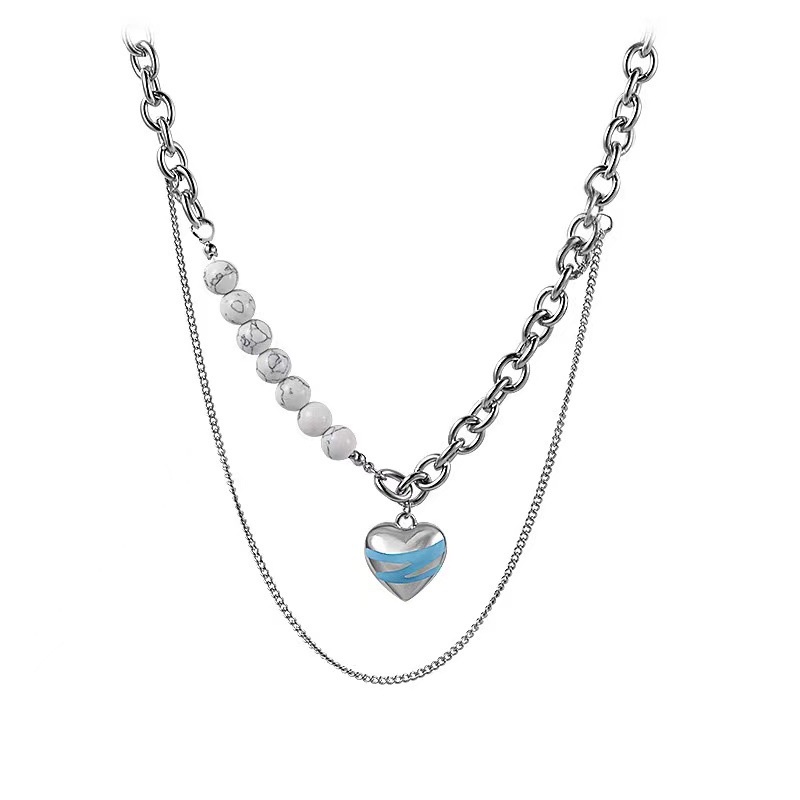 Detail Double layer twin putih pirus jahitan rantai liontin berbentuk hati kalung wanita ins dingin gaya Ko