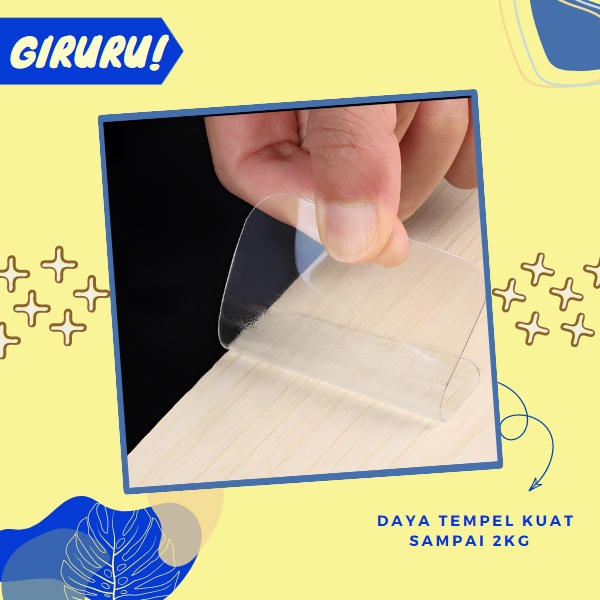 Fitur: β Digunakan untuk memasang alat dapur, kunci, remote, gantungan, handphone, dekorasi, gelas, dan barang-barang kecil lainnya β Dapat ditempelkan pada permukaan bertekstur β Dapat dicuci dan digunakan kembali, dan dapat dikupas tanpa bekas β Transparant, cocok untuk aplikasi di kaca, dinding, keramik, lemari dan permukaan rata lainnya β Daya tempel kuat sampai dengan 2 kg
