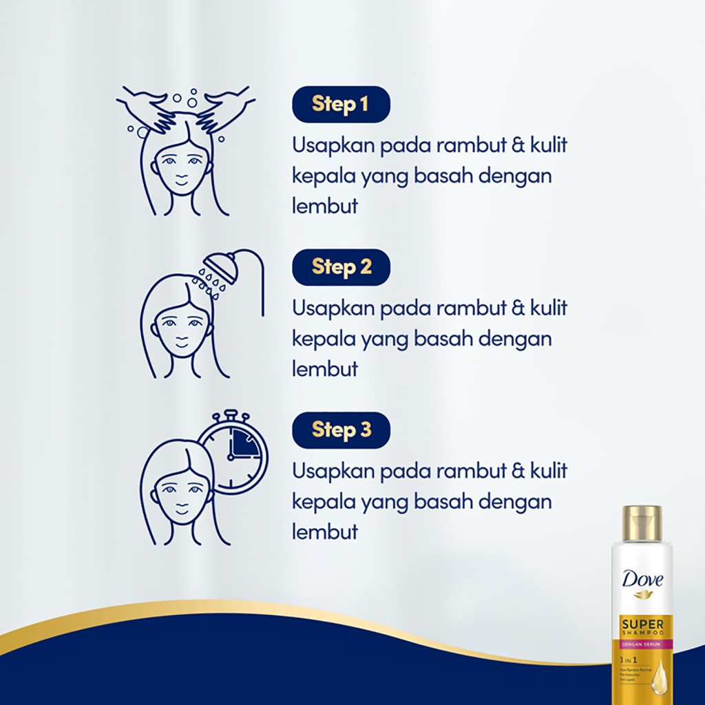 Cara Penggunaan: 1. Usapkan pada rambut basah, pijat hingga berbusa, lalu bilas dengan bersih. 2. Untuk hasil terbaik, gunakan Dove 1 Minute Super Conditioner setelah shampoo.