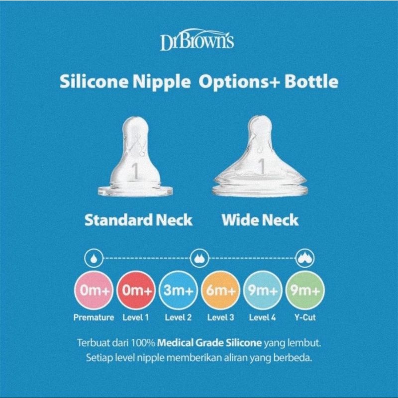 - Dr.Brown’s Replacement Nipple terbuat dari medical grade silicone dengan grade terbaik - Nipple Dr. Brown’s bertekstur lembut - Diciptakan dengan tahapan/level yang dibedakan berdasarkan kebutuhan nutrisi bayi. - Ideal digunakan untuk bayi usia 9 bulan+