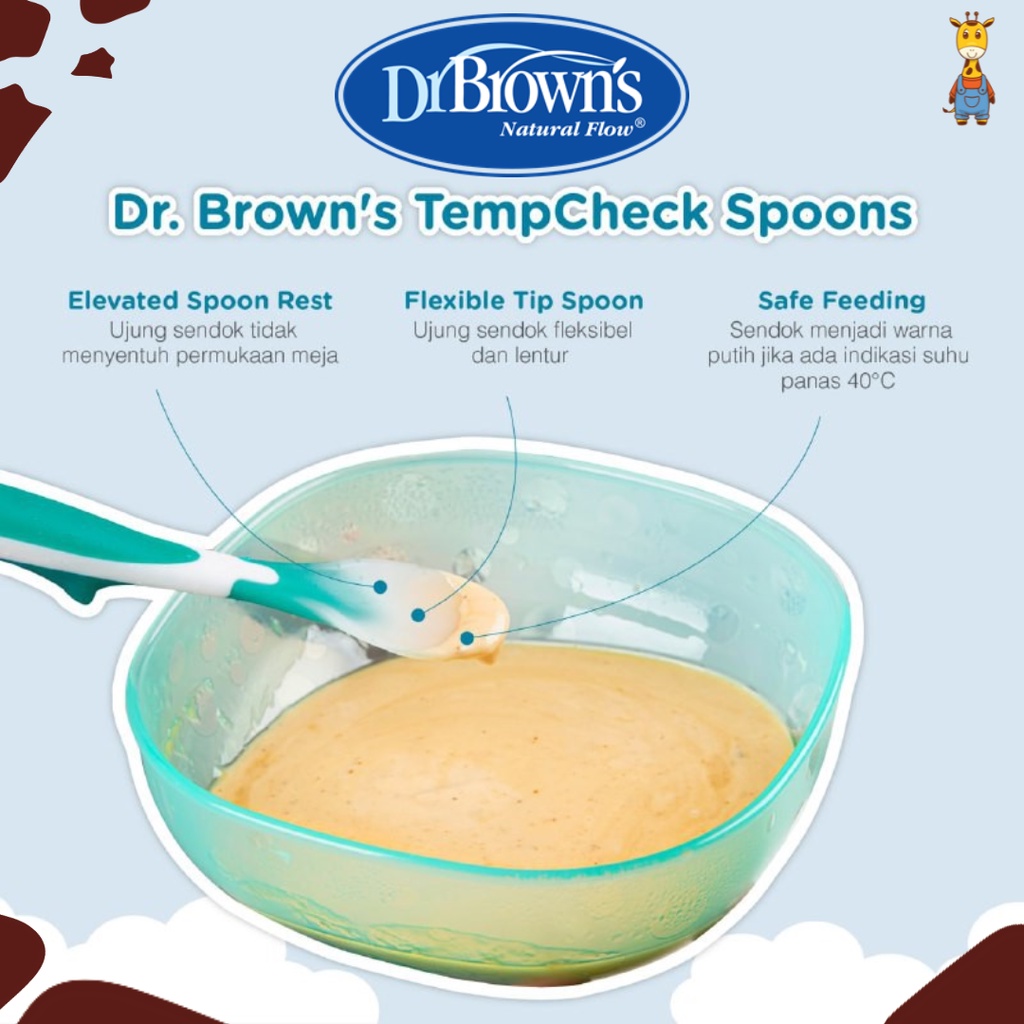 Mengapa Moms harus memilih Dr. Brown's TempCheck Spoons? - Safe Feeding – Sendok dapat berubah warna ketika menyentuh makanan bersuhu 40º C keatas sehingga si Kecil tidak akan makan makanan yang terlalu panas - Elevated Spoon Rest – Untuk mencegah ujung sendok menyentuh permukaan meja sehingga tetap terjaga kebersihannya - Flexible Tip Spoon – Ujung sendok lentur sehingga aman apabila digigit si Kecil namun tetap nyaman untuk menyeka makanan di sekitar area mulut