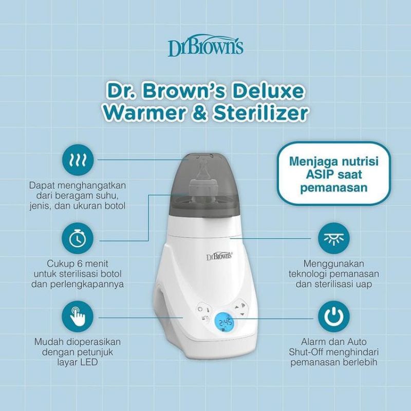 Dr. Brown's menghadirkan Deluxe Bottle Warmer and Sterilizer yang dapat digunakan untuk memanaskan ASI sekaligus dapat mensterilkan botol susu dan peralatan si Kecil. Dengan satu produk, Moms dapat menikmati 2 fungsi sekaligus! Spesifikasi Dr. Brown's Deluxe Warmer and Sterilizer: 1. Mudah dioperasikan dengan Petunjuk Layar LED 2. Dapat disesuaikan dengan beragam jenis botol susu, ukuran botol dan temperatur susu awal 3. Dilengkapi dengan Alarm dan Auto Shut Off untuk menghindari pemanasan yang berlebihan 4. Reservoir Air yang lebih besar untuk proses sterilisasi yang lebih praktis 5. 6 menit untuk sterilisasi botol susu beserta perlengkapanya 6. Diameter wadah : 7,5cm 7. 2pcs Storage Cap untuk menutup botol susu Wide Neck maupun Narrow Neck 8. Daya listrik : 500 Watt 9. Garansi : 1 Tahun Benefit Dr. Brown's Deluxe Warmer and Sterilizer 1. Proses Pemanasan dapat diatur sesuai dengan bahan dan ukuran botol susu serta suhu awal susu 2. Dapat digunakan sebagai alat sterilisasi untuk botol susu dan peralatan si Kecil 3. Proses pemanasan dan sterilisasi lebih merata dengan menggunakan sistem steam (uap air) 4. Dilengkapi dengan petunjuk untuk memanaskan susu atau makanan dari beragam bahan dan ukuran wadah atau botol SEBELUM PENGGUNAAN, SILAHKAN MEMBACA BUKU PETUNJUK HALAMAN 4 Cara penggunaan fungsi Warmer: 1. Lepaskan reservoir sebelum penggunaan. 2. Isi reservoir dengan air matang secara penuh. 3. Taruh kembali reservoir lalu Anda sambungkan kabel ke stop kontak. 4. Selalu pastikan untuk melepas seluruh Internal Vent System dan parts botol susu 5. Ganti tutup botol susu Anda dengan Storage Caps yang telah disediakan. Disarankan untuk melonggarkan Storage Caps. 6. Letakan Botol Susu ke dalam Keranjang Penghangat secara perlahan. 7. Tekan tombol "Power On" dan pengaturan lainnya sesuai dengan jenis botol, ukuran botol dan temperature susu sesuai pada buku petunjuk penggunaan. 8. Tekan tombol “Start” lalu waktu pada layar LED akan menghitung mundur. 9. Setelah selesai, alarm akan berbunyi dan ASI/ makanan siap untuk disajikan 10. Secara perlahan buka penutup Dr. Brown’s Deluxe Warmer and Sterilizer dan angkat botol susu dengan Keranjang Pengangkat.