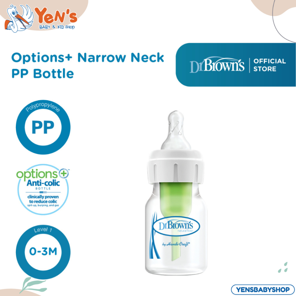 Dr. Brown's Narrow Neck Options Baby Bottle 60ml / 2oz, adalah varian baru botol susu Dr Brown’s yang memungkinkan pengguna untuk memakai atau tidak memakai vent/ventilasi pada botol tersebut. Dengan hal ini diharapkan pengguna bisa menggunakan botol lebih lama mengikuti perkembangan bayi. Botol susu Dr Brown’s dikenal dengan inovasi ventilasi didalam botol. Tujuannya adalah sebagai fitur anti-colic sekaligus mencegah gelembung pada ASI/formula. Pada botol merek lain ditemukan adanya gelembung karena sistem anti-colic terletak di nipple sehingga udara langsung berhadapan dengan cairan dan terjadilah gelembung, adapun Dr Brown’s udara melalui ventilasi dan keluar di bagian ujung ventilasi. Tidak adanya gelembung di ASI perah diklaim menjaga vitamin C yang terdapat di ASI perah Fungsi inilah yang menjadikan Dr Brown’s biasanya dijadikan rujukan dokter untuk bayi yang mudah colic, mudah muntah/gumoh, mudah cegukan, dan mudah masuk angin setelah minum ASI/formula dari botol.