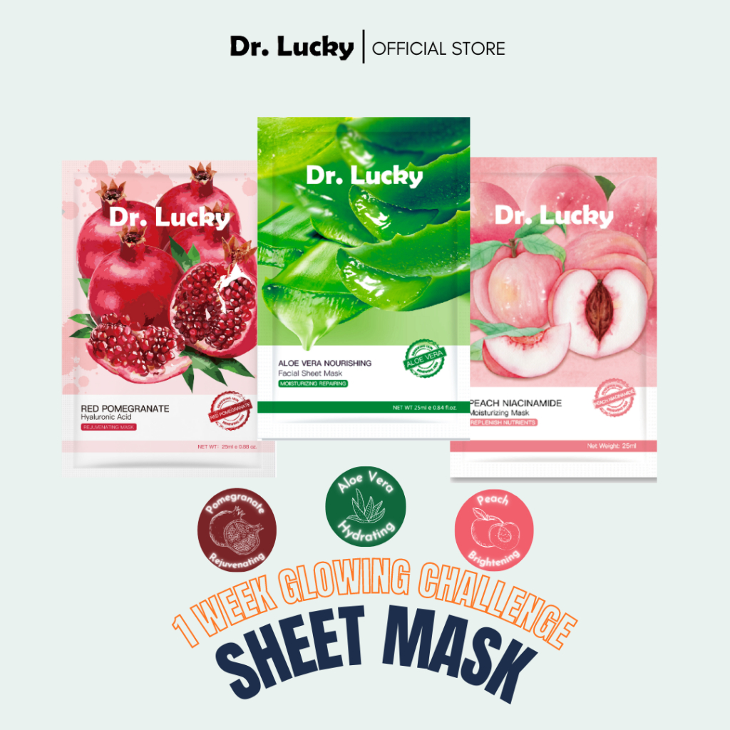 Fitur Produk: Dr. Lucky Pomegranate Sodium Hyaluronate Mask mengandung ekstrak buah Punica granatum dan natrium hialuronat yang dapat melembabkan dan menghidrasi, meredakan kulit kering, merevitalisasi elastisitas dan kecerahan kulit