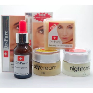 DR PURE paket perawatan, sudah termasuk - Cream Siang 20gr - Cream Malam 20gr - Free Whitenng Beauty Soap - Serum wajah 20ml