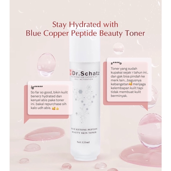 DR SCHATZ BLUE COPPER PEPTIDE TONER : Fungsi : Membantu melembabkan kulit mengecilkan pori2 Non comedogenic Mencerahkan kulit Tidak mengandung Paraben dan SLS Anti aging dan menenangkan kulit Antimicroba Antioxidan dan anti inflamasi